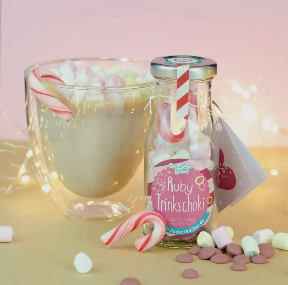 Cosa c'è dentro? La nostra unica bottiglia fai-da-te contiene tutti gli ingredienti di cui hai bisogno per preparare una deliziosa tazza di cioccolata calda al cioccolato ruby. Innanzitutto, la bottiglia viene riempita con sufficienti gocce di cioccolato bianco al caramello.