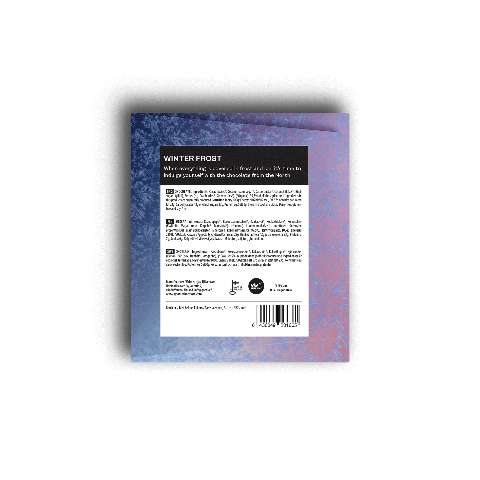 Cioccolato fondente guarnito con bacche nordiche glassate. Quando tutto è coperto di gelo e ghiaccio, è il momento di concedersi il cioccolato del Nord.