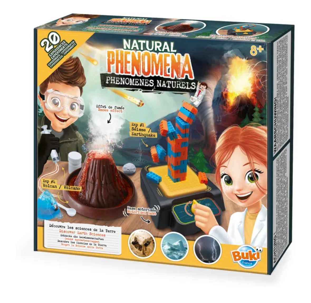 - 20 esperimenti per scoprire i disastri naturali e i fenomeni meteorologici della Terra. Fai sperimentare alla figurina di Leo i peggiori cataclismi: eruzioni vulcaniche, terremoti, trombe d'acqua, caduta di meteoriti, ecc. Crea tre tipi di eruzione vulcanica: eruzione sottomarina, eruzione esplosiva ed eruzione lavica effusiva con effetti di luce e fumo.