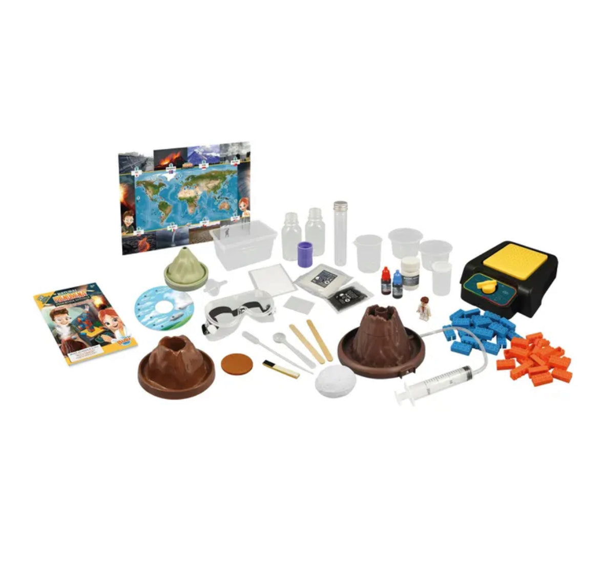 Con il simulatore di terremoti, costruite gli edifici con i mattoncini in dotazione e sottoponeteli alla base motorizzata che riproduce la scala di magnitudo. Include: un planisfero per localizzare i fenomeni naturali. Istruzioni illustrate a colori con attività. Richiede 3 batterie LR03-AAA (non incluse) per il vulcano e 4 batterie LR03-AAA (non incluse) per il simulatore di terremoti. A partire dagli 8 anni.
