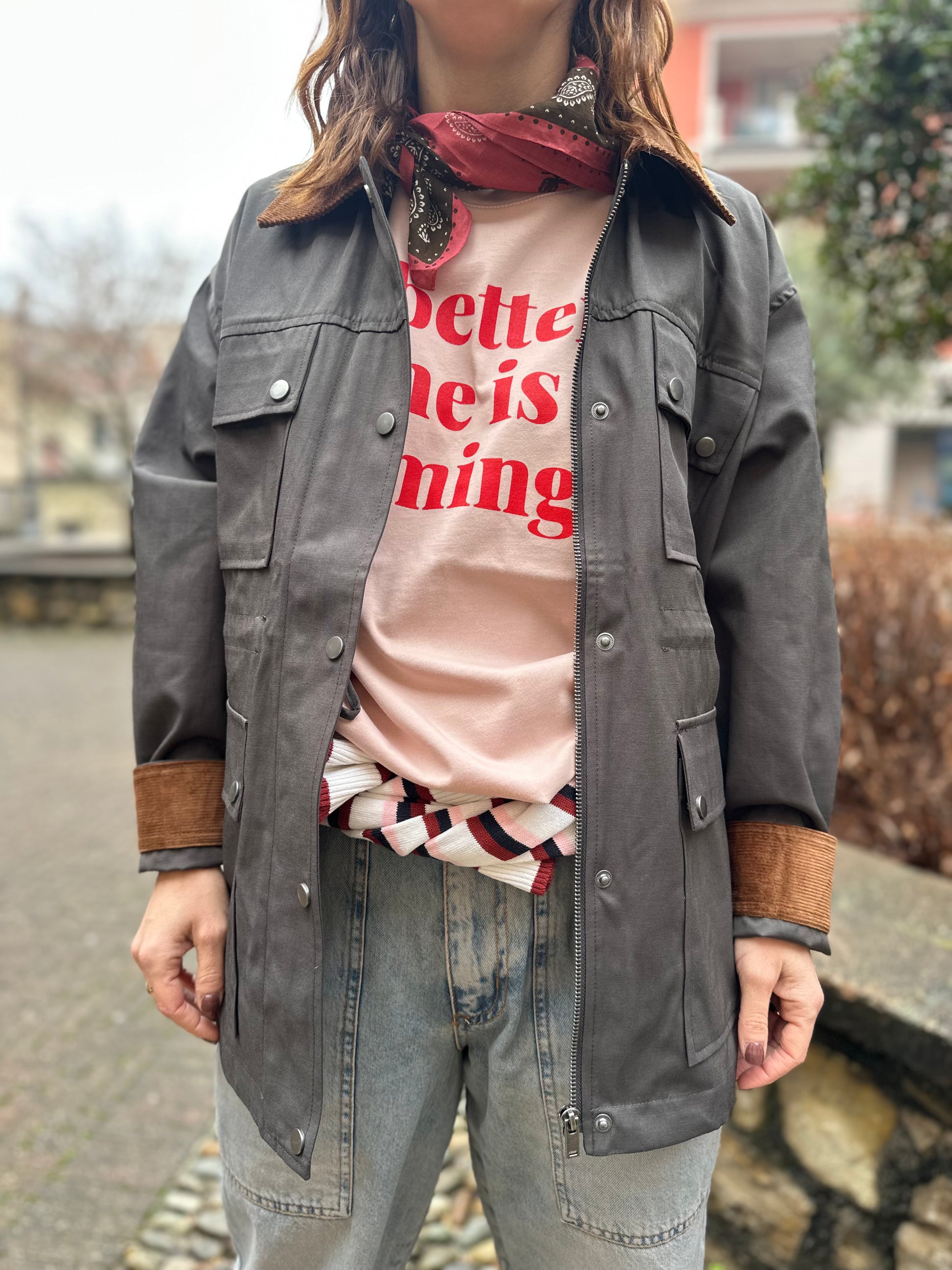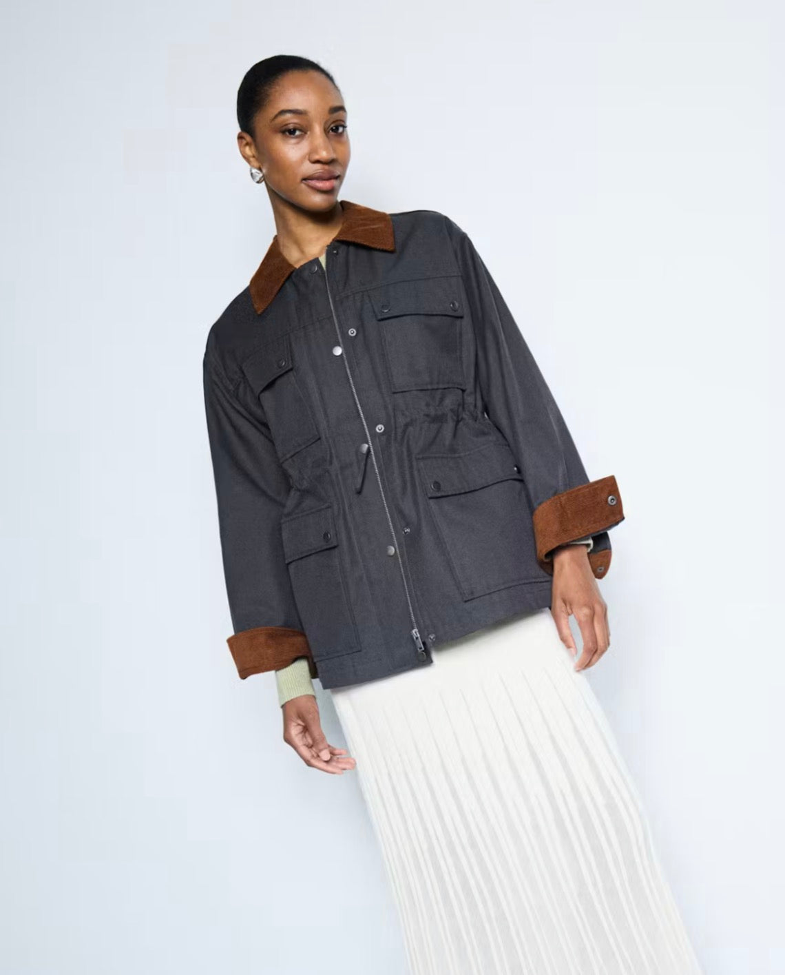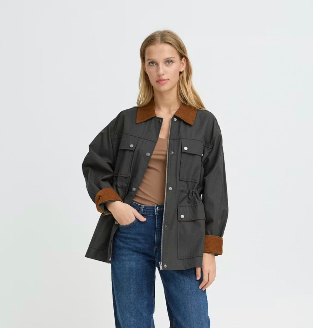 Giacca utility dal gusto rilassato con colletto in velluto a coste e chiusura con bottoni automatici. Vita regolabile e quattro ampie tasche con patta. Le cuciture a vista ne risaltano il look strutturato e senza tempo.