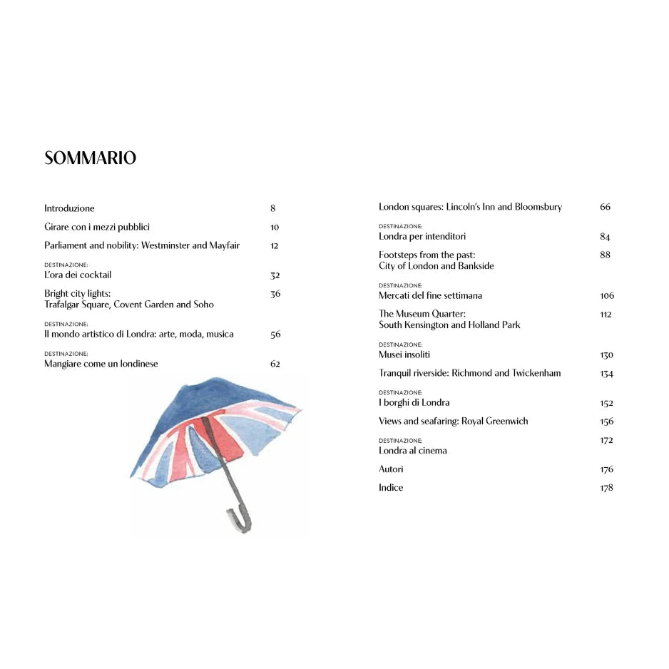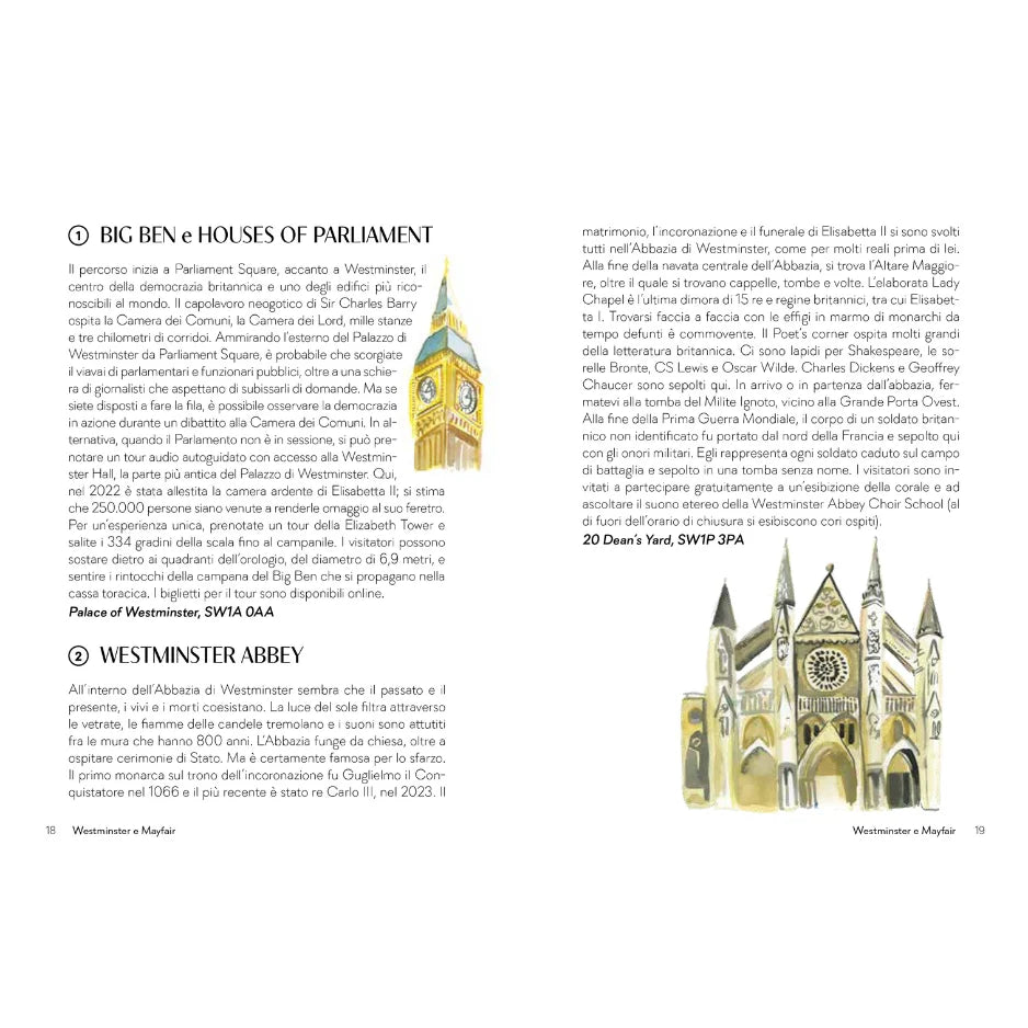 Una guida con illustrazioni accattivanti e tante informazioni utili, che accompagna il lettore alla scoperta di Londra attraverso 7 passeggiate meticolosamente dettagliate e lo guida a visitare a piedi i luoghi simbolo della città e i suoi angoli più nascosti. Acquerelli dai colori vivaci ritraggono meraviglie architettoniche, giardini, monumenti storici, centri culturali, mercati, paradisi gastronomici e tanti altri posti segreti che contribuiscono a creare la magia di Londra. Riflessioni culturali, racconti, aneddoti e dettagli istruttivi accompagnano le illustrazioni, rendendo questo volume dalla notevole qualità artistica tanto pratico quanto bello.