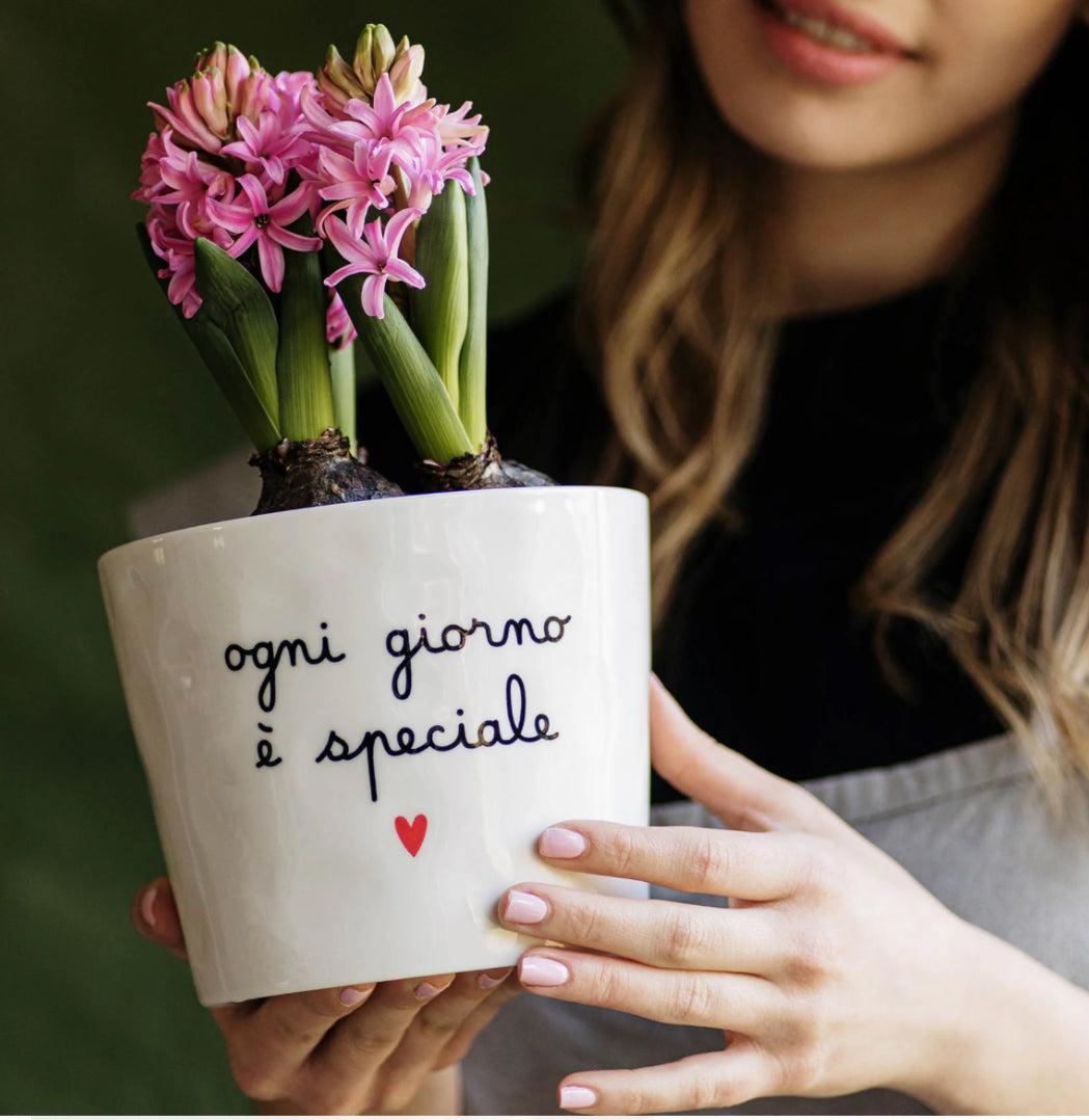 Vaso bianco in gres porcellanato decoro Parlami d'amore, con sottovaso