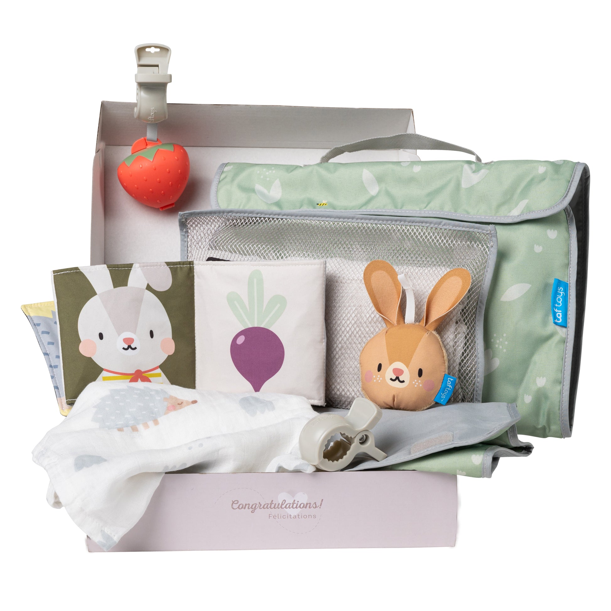 Il kit include una fascia grande, un fasciatoio che si ripiega in una borsa per il trasporto (contiene tutti i prodotti del kit), due clip di plastica, un portaciuccio a forma di fragola, un coniglietto sonaglio e un libro per carrozzina bifacciale.