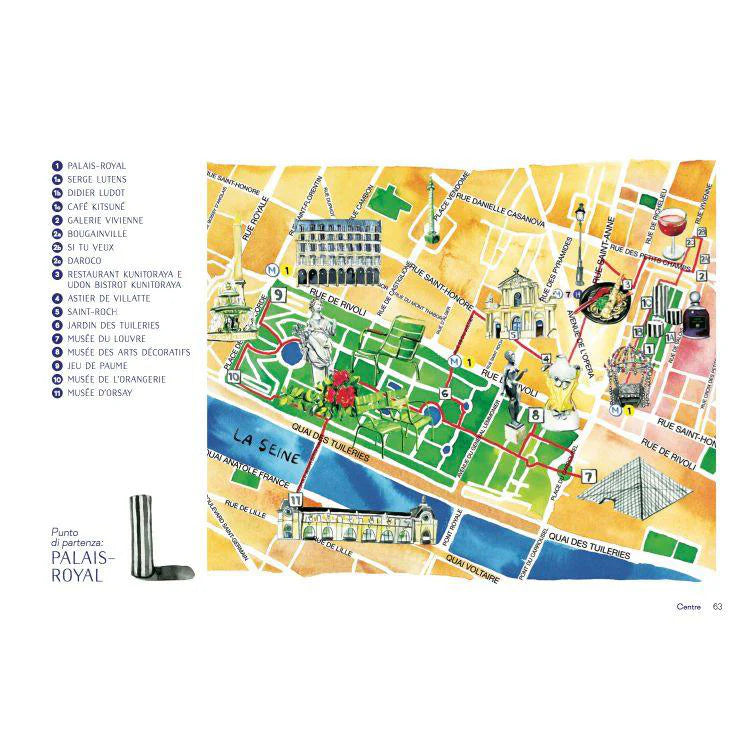 Questa guida ricca di informazioni, corredata da pratiche mappe e suggestive illustrazioni ad acquerello, accompagna il lettore a scoprire la Ville Lumière attraverso una lista di luoghi da non perdere, suggeriti dall’amico parigino che ognuno di noi vorrebbe ardentemente avere!… Vengono proposte 7 passeggiate a piedi curate in ogni dettaglio; di facile consultazione sono le pittoresche mappe acquerellate con le icone colorate dei siti segnalati, che guidano il lettore attraverso le romantiche e tortuose strade parigine.