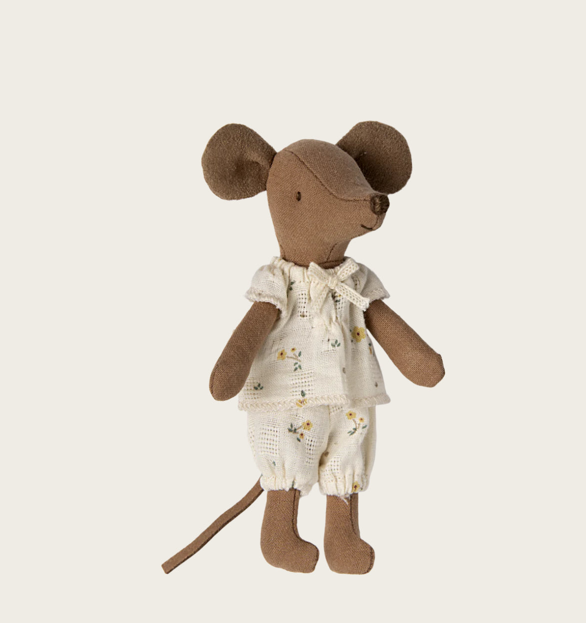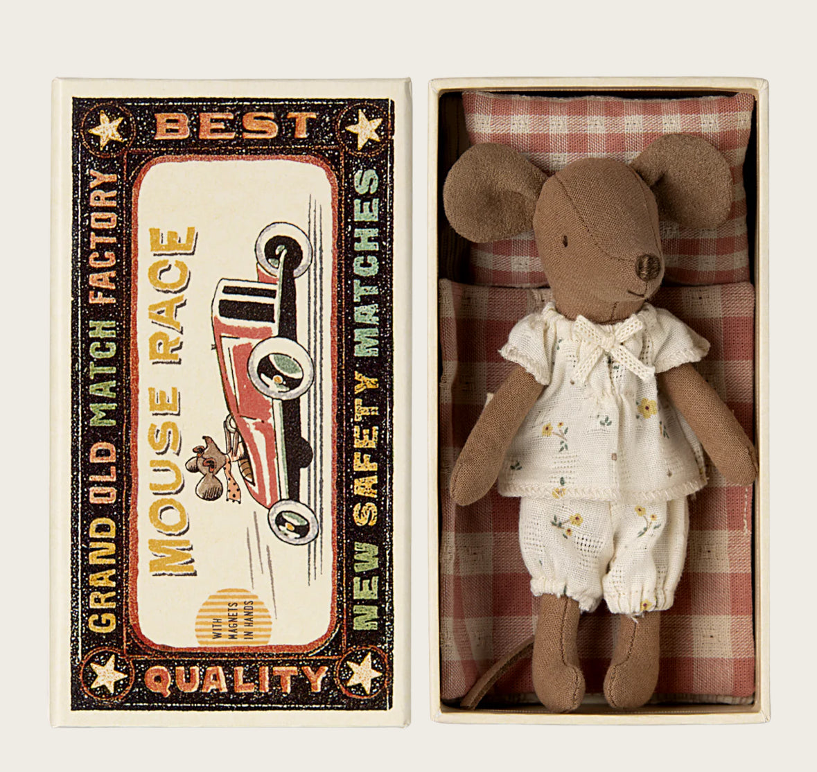 Un classico di Maileg. Questo topo è pronto per ore e ore di gioco e dorme stretto nella scatola di fiammiferi. I vestiti e le lenzuola sono disponibili in stampe uniche e in bellissimi colori.