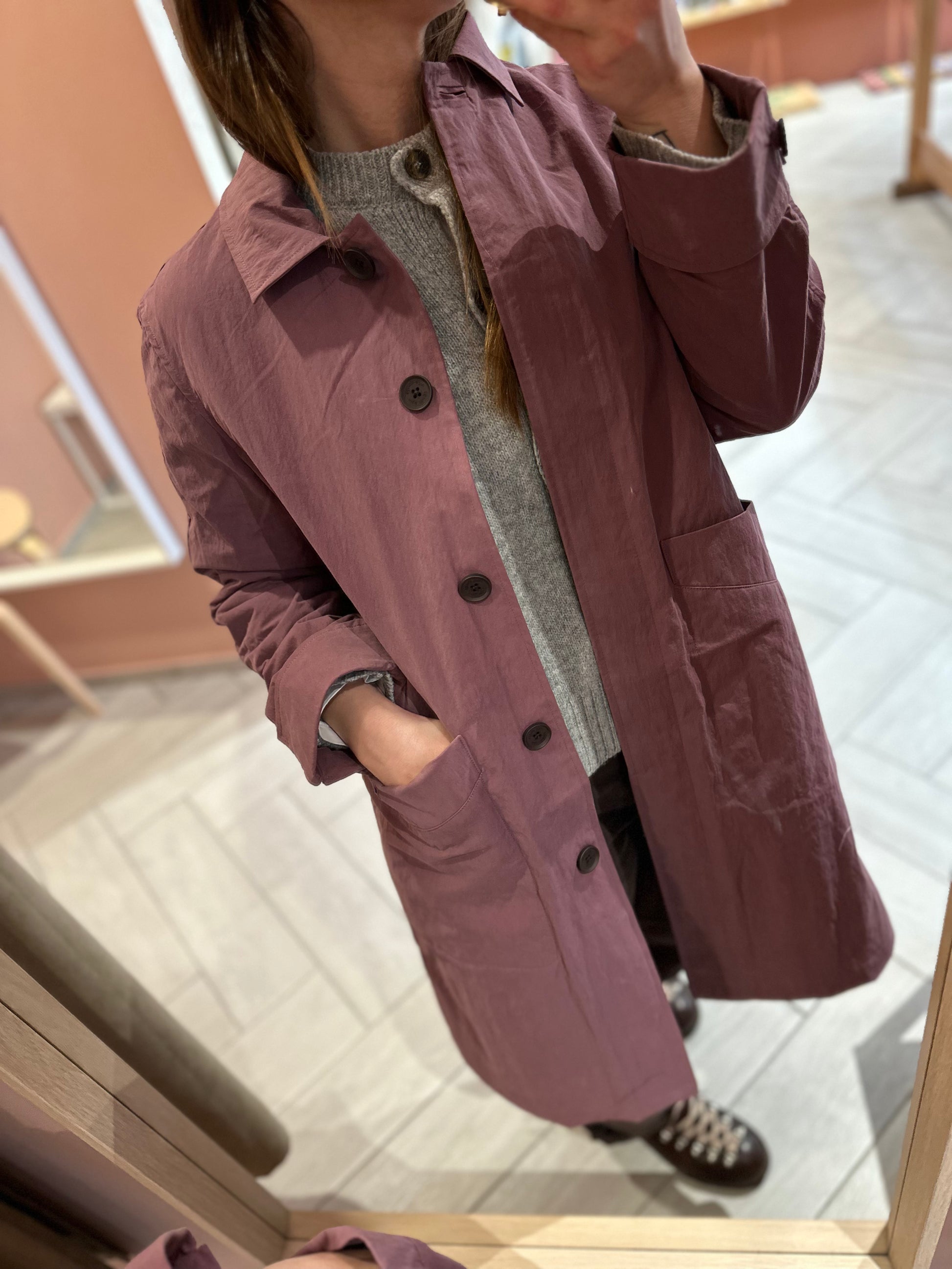Spolverino idrorepellente realizzato in misto cotone e nylon. Presenta collo a camicia, abbottonatura frontale nascosta e tasche con bottone. Include spacco e bottone sul retro e manica rifinita con risvolto e bottone.