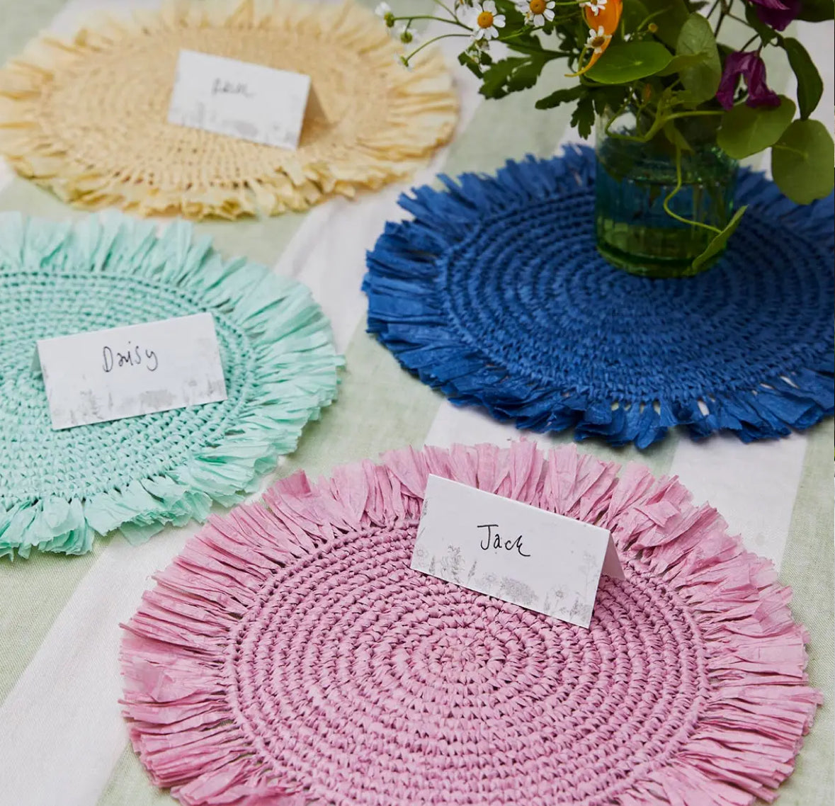 Ogni tovaglietta è realizzata a mano con carta di rafia proveniente da fonti sostenibili.